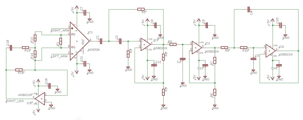 To complete the design a right leg driver is also required. I found a sample design in the AD620 datasheet. Refer the datasheet for component values.